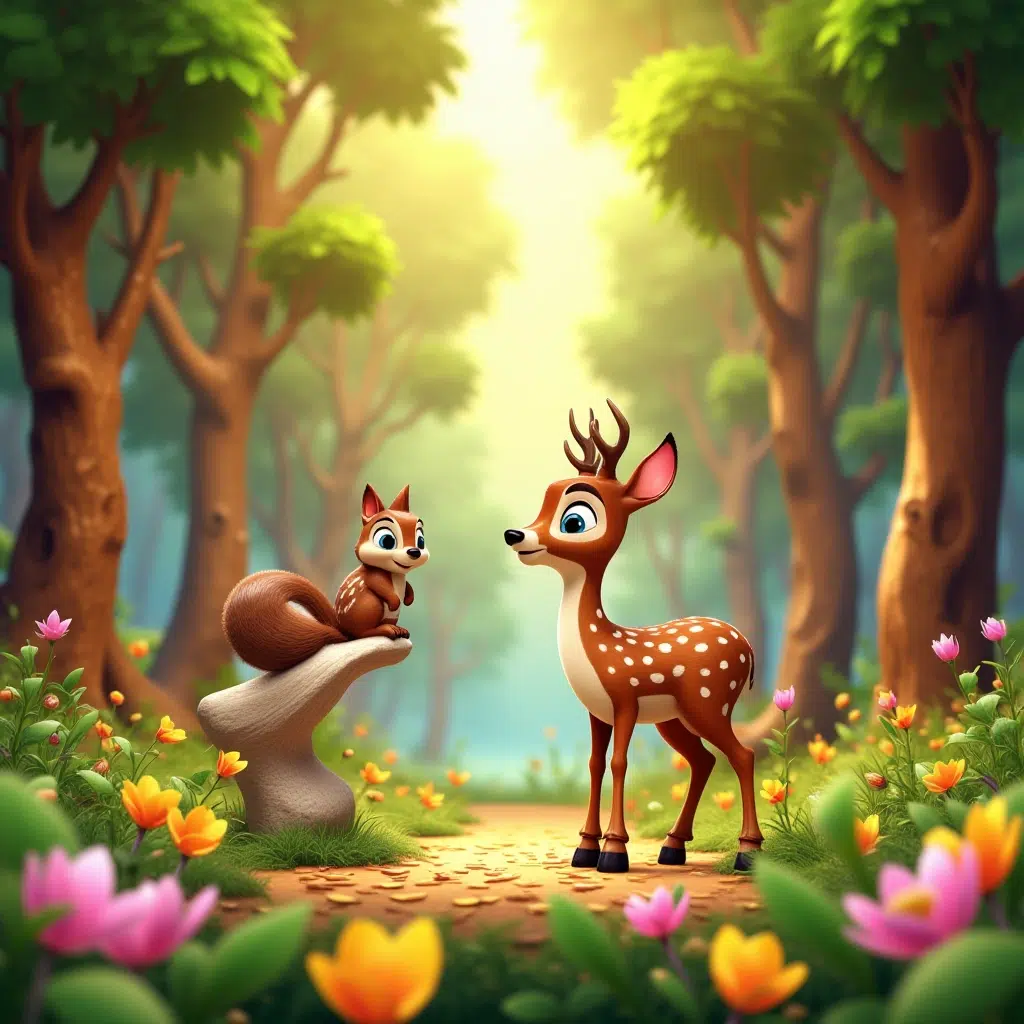 Prvo je sreo malu vevericu koja je skakutala po granama. „Šta tražiš, Bambi?“ upitala ga je veverica.