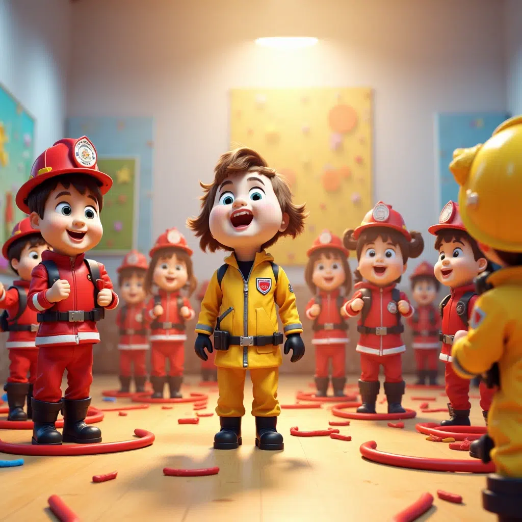 „A sada, vreme je za igru!“ rekao je Ivan i iz svoje torbe izvadio male crvene kacige, crvene konopce i maketu kuće napravljenu od kartona. „Bićete moji pomoćnici danas. Zadatak je jednostavan – spasite plišane igračke iz kuće i ugasite zamišljeni požar.“