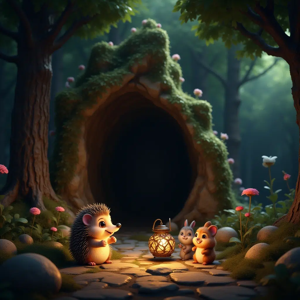 Mali ježić po imenu Piko šetao je šumom sa svojim prijateljima – zekom Lunom i vevericom Tinom. Dok su trčkarali, naišli su na veliku, tamnu pećinu koja je delovala kao da skriva tajne.