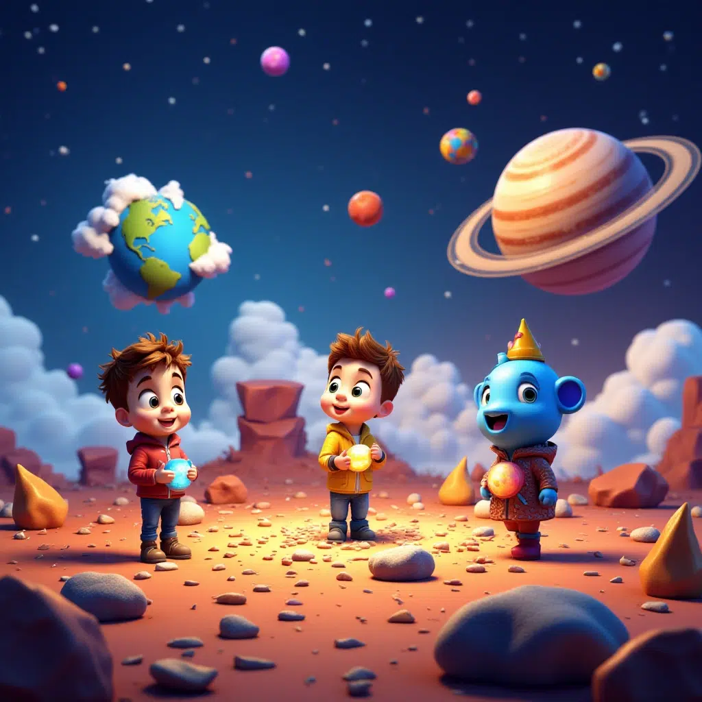Kada su spojili prvi deo slagalice, soba je odjednom zasijala, a deca su se našla usred svemira! „Vau, gde smo to?“ uzviknuo je Marko, gledajući oko sebe. Ispred njih se pojavila ogromna, sjajna lopta. Bila je to Sunce.