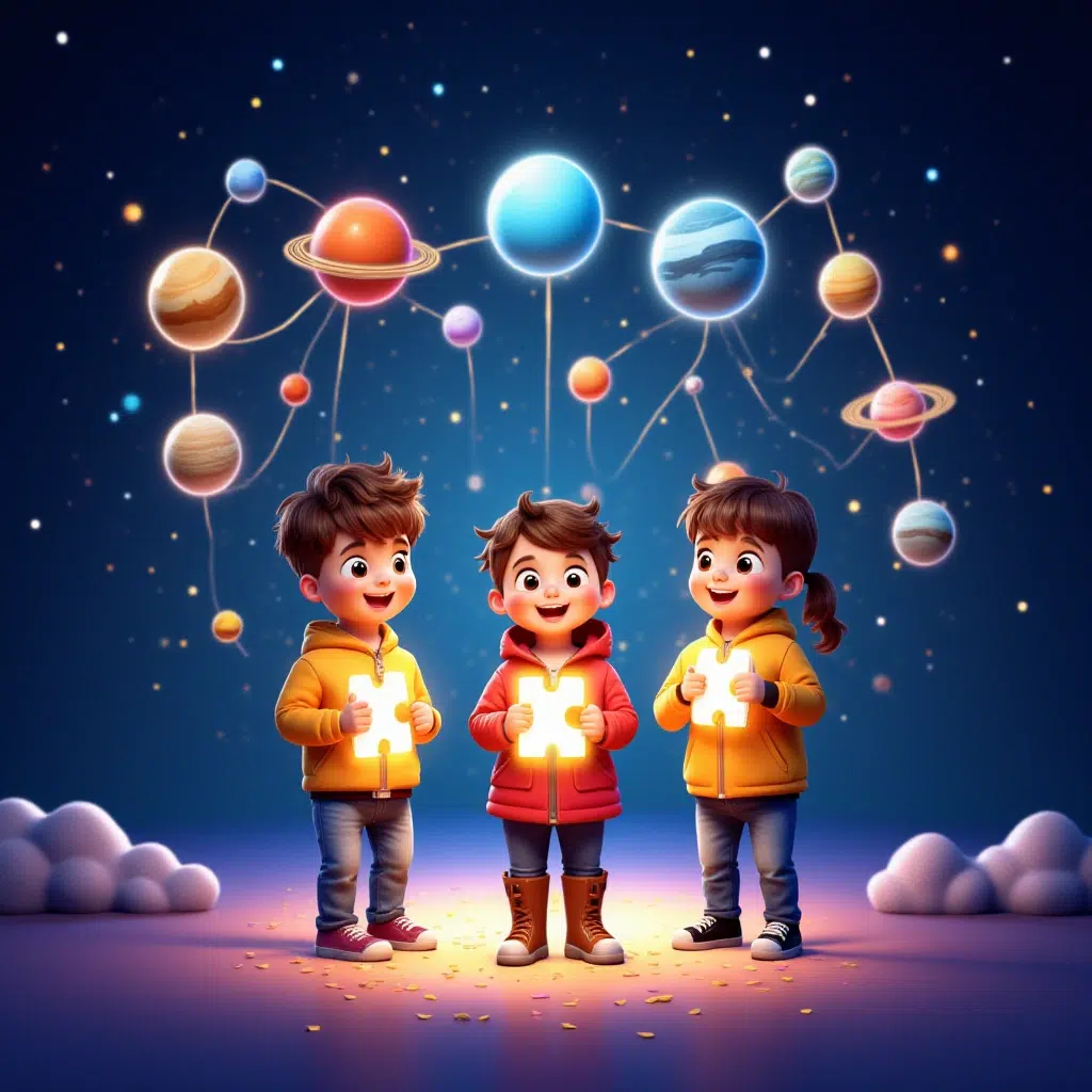 Kada su spojili poslednji deo slagalice, svi delovi planeta su zasijali i formirali prelepu mapu Sunčevog sistema. Deca su stajala usred svemira, gledajući u mapu koju su zajedno sastavili.