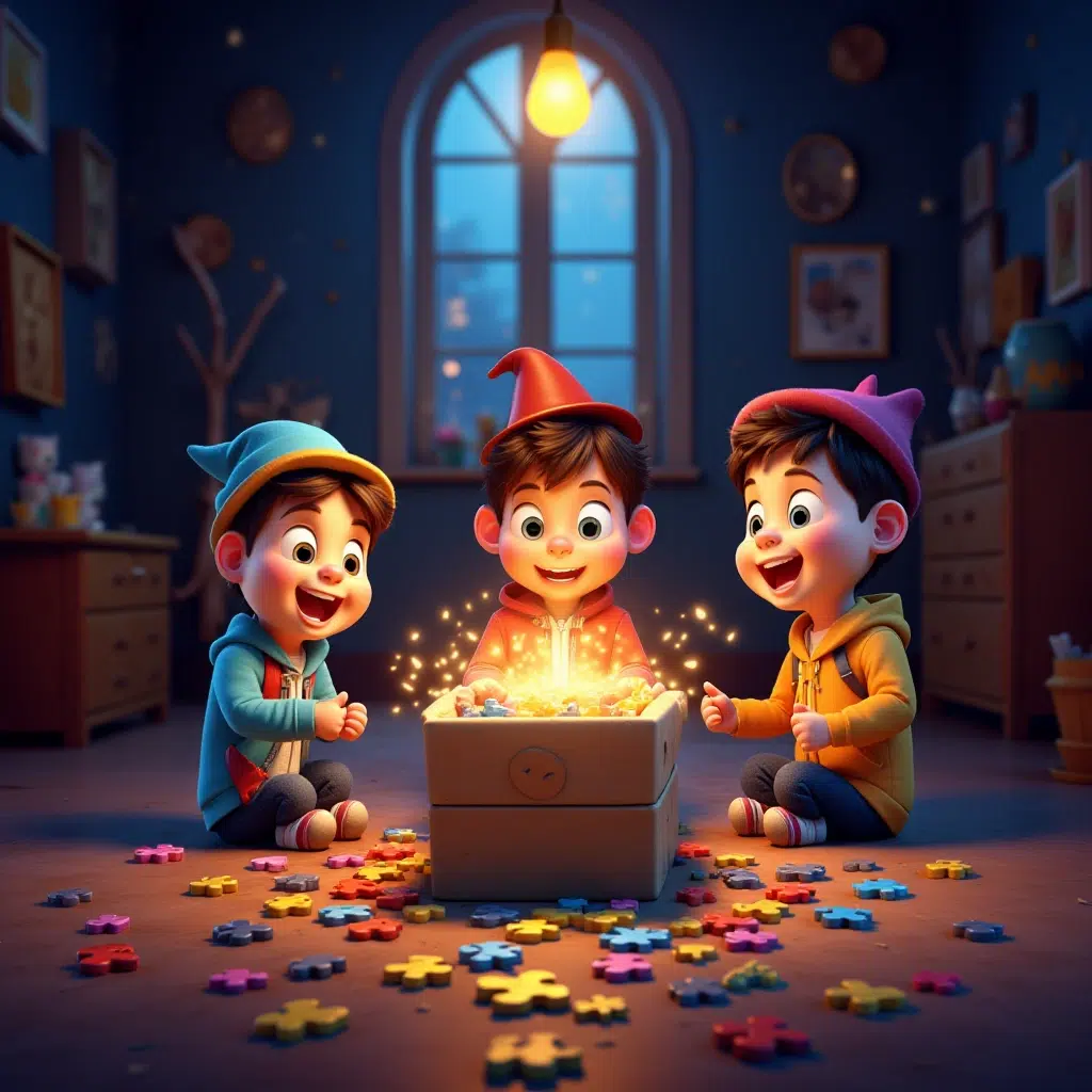 Jednog kišnog popodneva, Marko, Lea i Ivan pronašli su staru kutiju na tavanu Markove kuće. Na kutiji je pisalo: „Sastavite slagalicu i otkrijte tajne svemira!“ Radoznali, brzo su otvorili kutiju i ugledali mnogo šarenih delova slagalice. Bili su tu komadići u bojama plave, crvene, zlatne i sive, a neki su čak svetlucali kao prave zvezde.