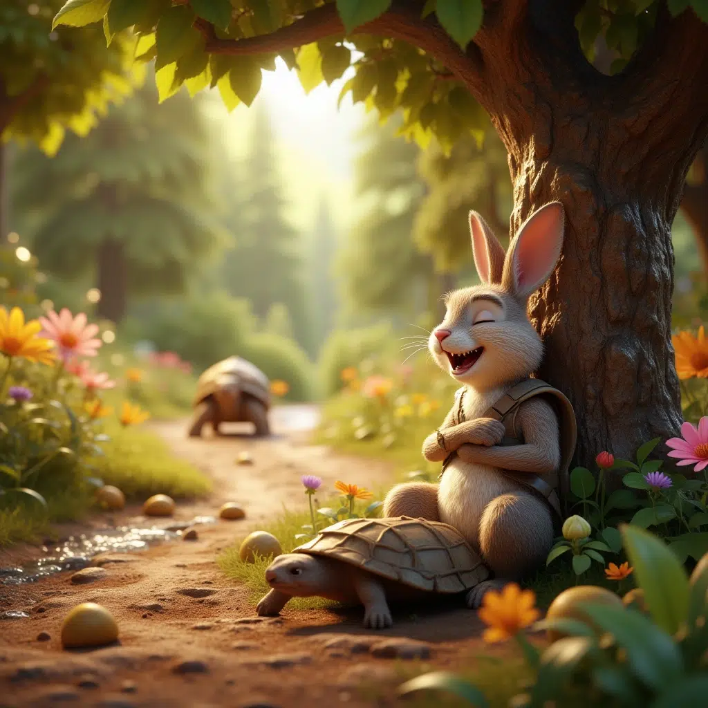 Zec je već prešao više od pola staze i nije mogao da vidi Kornjaču nigde iza sebe. „Ovo je smešno! Imam toliko vremena da se malo odmorim,“ rekao je Zec i seo ispod drveta. Vetar je nežno duvao, a cvrčci su pevali uspavanku. Zec je ubrzo zadremao, uveren da mu Kornjača nikada neće prići.