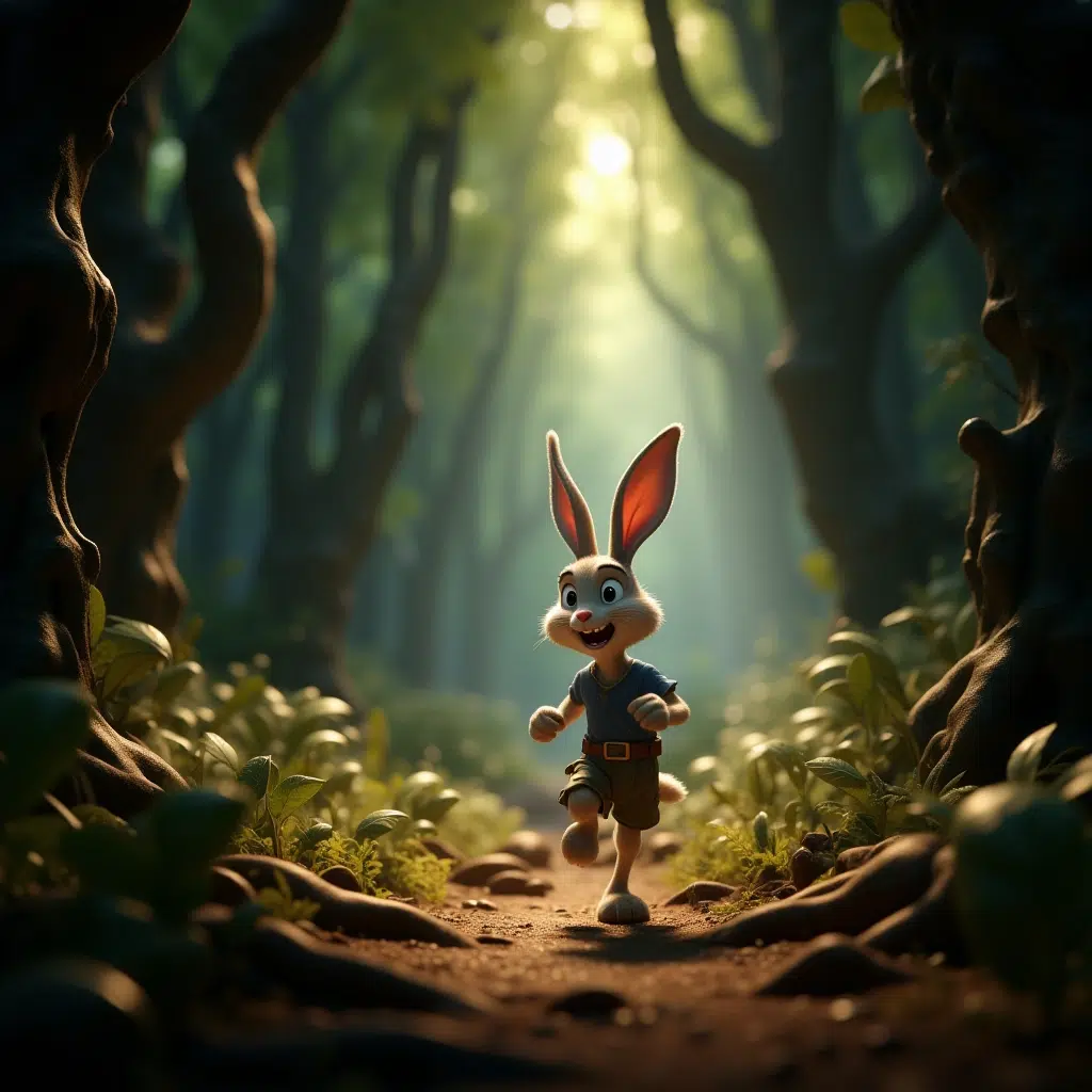 Kada se probudio, sunce je već bilo visoko. „Oh, ne! Zaspao sam!“ viknuo je Zec i brzo pogledao oko sebe. U želji da nadoknadi izgubljeno vreme, odlučio je da pređe kroz gustu šumu, nadajući se da će pronaći prečicu.