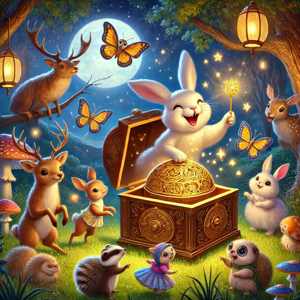 Dok su razgovarali, svetlucavi leptiri iz muzičke kutije kružili su oko njih, dodajući čarobni sjaj noći. Vetar je lagano pomerao krošnje, kao da šuma šapuće poslednje uspavanke svojim stanovnicima.